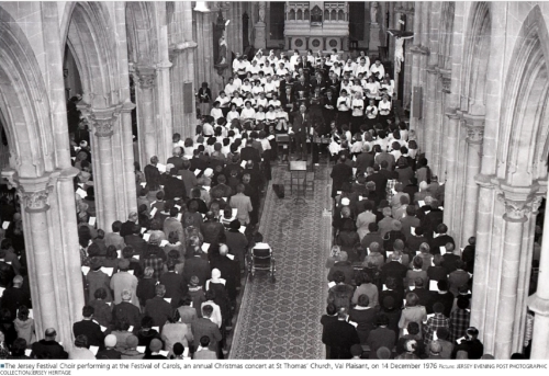 1976 Festival of Carols at St Thomas’: As currently, the evening started with Once in Royal David's City and finished with Minuit, Chrétiens and O Come All Ye Faithful. The Choir's own items included Sir Christémas, Sans Day Carol, Il est né le Divin Enfant and Shepherd's Pipe CarolThe conductor in the photo is John Lobb.